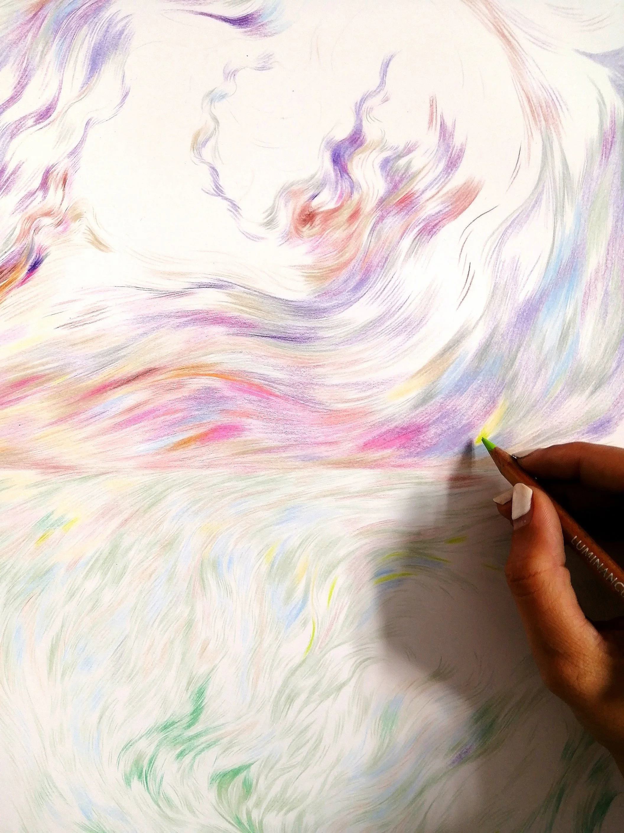 Cela m’autorise une connexion directe avec la couleur et le mouvement ; ainsi que l’ouverture d’un rapport intuitif avec mes mondes intérieurs. La fin d’un dessin se détermine ainsi à la fin d’une émotion, dont la nature est, comme toute chose, l’impermanence.