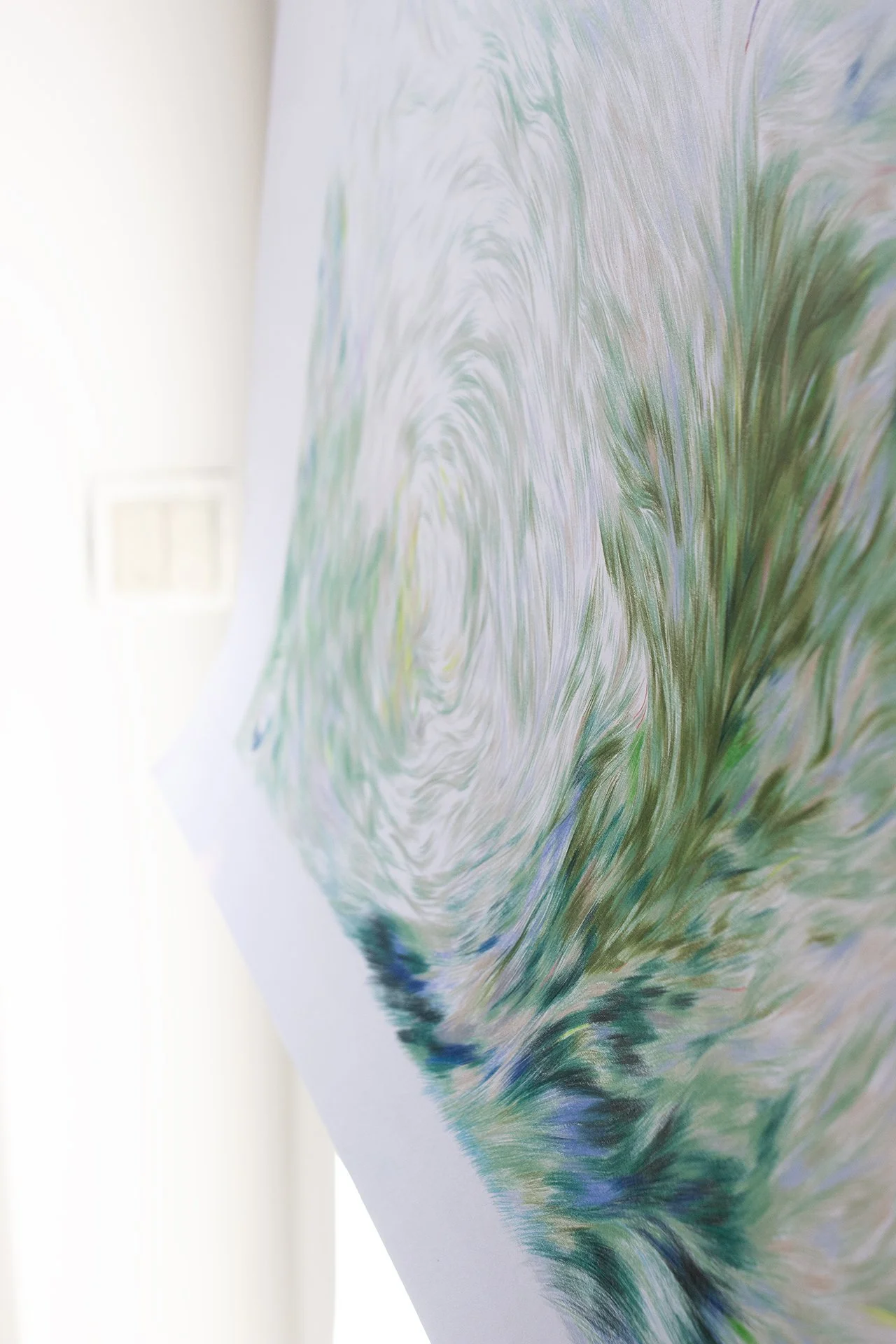 Je vois ce dessin comme un grand espace naturel fait de ciel et d’herbe, à travers lequel un autre écran se révèle, si je laisse mes émotions se synchroniser au vent, je peux entr’appercevoir dans le ciel le bougainvillier de la Villa Safae, la maison qu’elle avait a construit l’année de ma naissance, et dans l’herbe des visages, peut-être les visages de son âme qui, libres, s’amusent à me saluer à travers les mouvements du vent qui structurent la prairie.